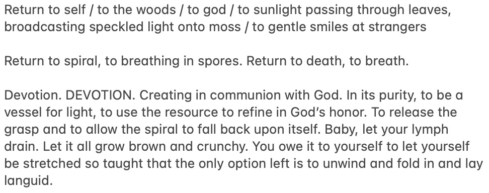 Last night I cried and wished myself to disintegrate. It feels good to change my format. Mostly, I am currently concerned with the process of getting closer to myself, which I also equate to getting closer to God. That may come across as self-obsessed. Of course, if you know what I am speaking of then I should not need to explain much further than that. Truthfully, I don’t wish to do much elaborating anymore. What I have come to understand is a necessity of trust. In God, self, love, words. In my body, in the chaos. I am not seeking for much outside of my self but I do feel a deep longing to create in the current moment and body I sit in.