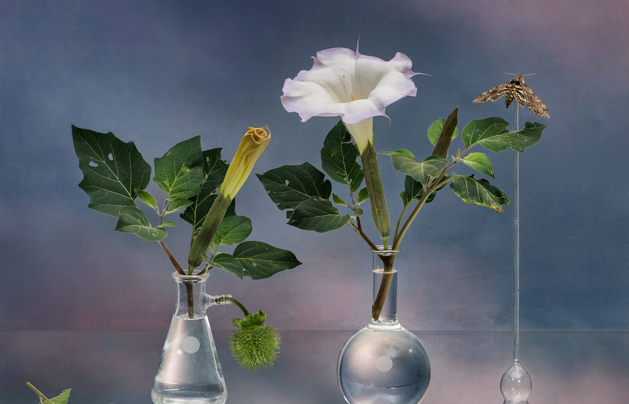 also known as thornapple, jimsonweed, devil’s trumpet, and moonflower, datura grows on just about every continent, and is a remarkable and imposing combination of beauty and deadliness. datura is a member of the Nightshade family; the sister of tomatoes, eggplants, tobacco, peppers, and potatoes, and her stunning, massive white flowers bloom by the moon, and close before noon the following day.